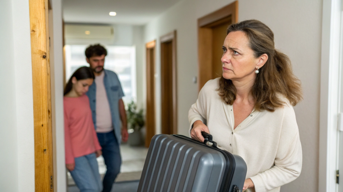 Алексей стоял в коридоре, не понимая, что произошло. Его сумка лежала у ног. Надя выглядывала из комнаты — растерянная, со скомканным платком в руке.