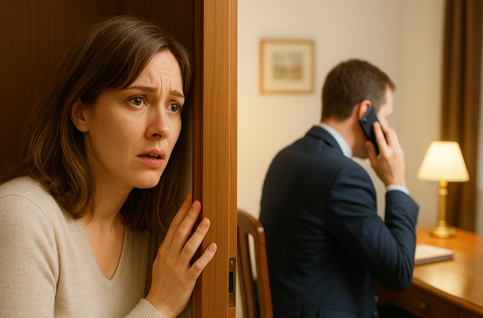 Неожиданно вернувшись поздно вечером домой, Мила тихо открыла входную дверь. В квартире было темно, только из кабинета мужа пробивался слабый свет лампы. Она уже хотела позвать его, но вдруг остановилась — из комнаты доносился приглушённый голос.