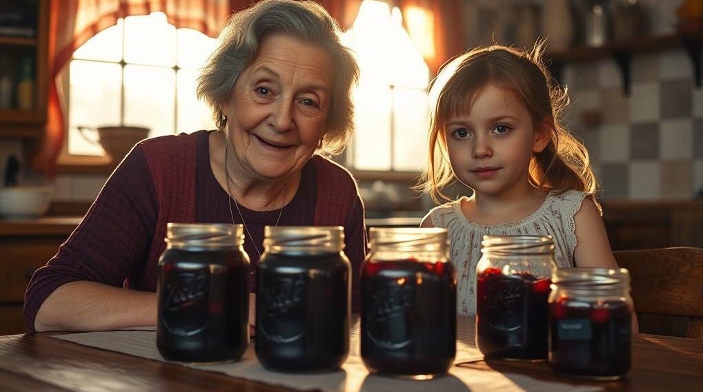 А бабушка смотрела со своего кресла через всю кухню на ряд блестящих банок вдоль окна; особенно выделялась та самая с кривой крышкой. И вдруг ей стало ясно: пусть банка стоит неровно — зато внутри сохранён вкус лета и их общий день, наполненный смыслом для обеих.