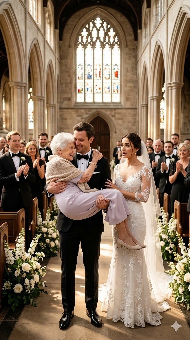 Волна смущённого смеха прокатилась по собору, быстро затихнув, когда гости поняли, что это не шутка. Луис пронёс миссис Элену несколько шагов по проходу, пока она улыбалась—гордая, победоносная. В зале раздался тревожный шёпот.