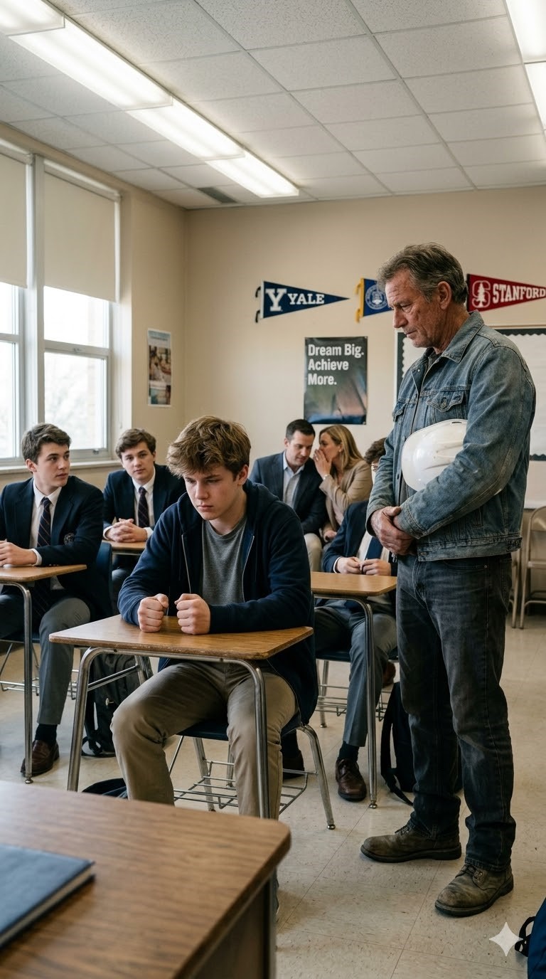 Они насмехались надо мной за то, что я пришёл на День Карьеры с запачканным, изношенным поясом для инструментов—пока скорбящий мальчик не встал и не поделился признанием, которое погрузило комнату в тишину, превратив их смех в ошеломлённое раздумье за считанные секунды.